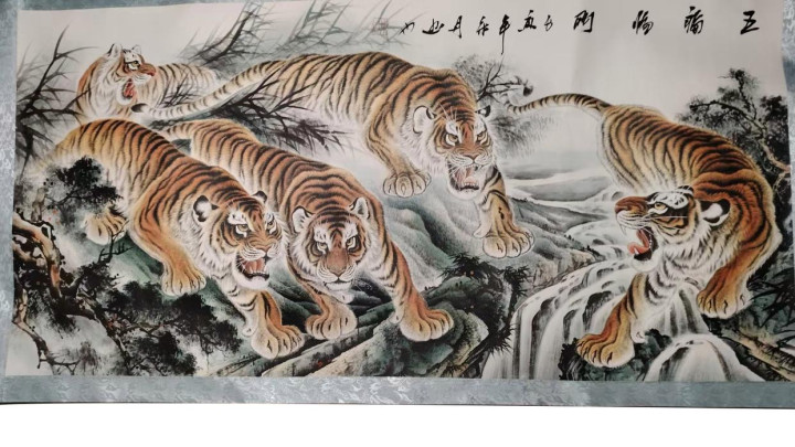 《五福临门》是谭乐丹的代表作之一,这幅巨制采用横轴形式,五只老虎神态各异,栩栩如生。